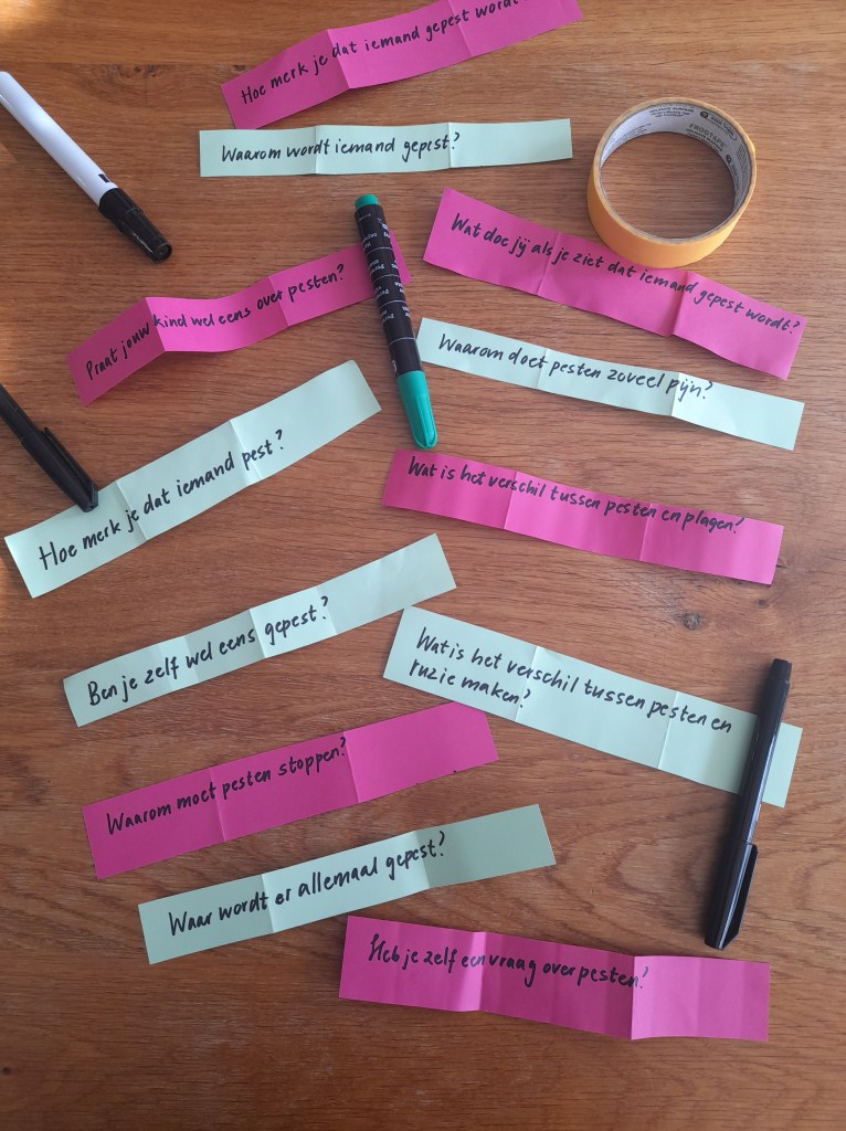 Verbinding zoeken en houden met je kind. Praten, een arm om iemand heen, noch de gepeste of de pester beschuldigen. Samen zoeken naar oplossingen. Wie mag er van jouw kind helpen?